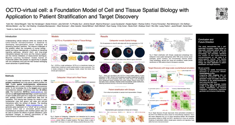 The OCTO-virtual cell poster demonstrates how large-scale, multimodal machine learning models trained on diverse spatial datasets can capture the complexity of tumor-immune interactions, enabling improved patient stratification and target discovery. “OCTO-virtual cell is a step function improvement in how we interpret the cellular and spatial architecture of human tumors,” said Yubin Xie, Ph.D., Senior Machine Learning Scientist at Noetik and presenter. “By training on vast amounts of multimodal data, it learns rich, generalizable representations of biology - helping us identify distinct patient subpopulations and uncover new, spatially informed drug targets that were previously inaccessible."