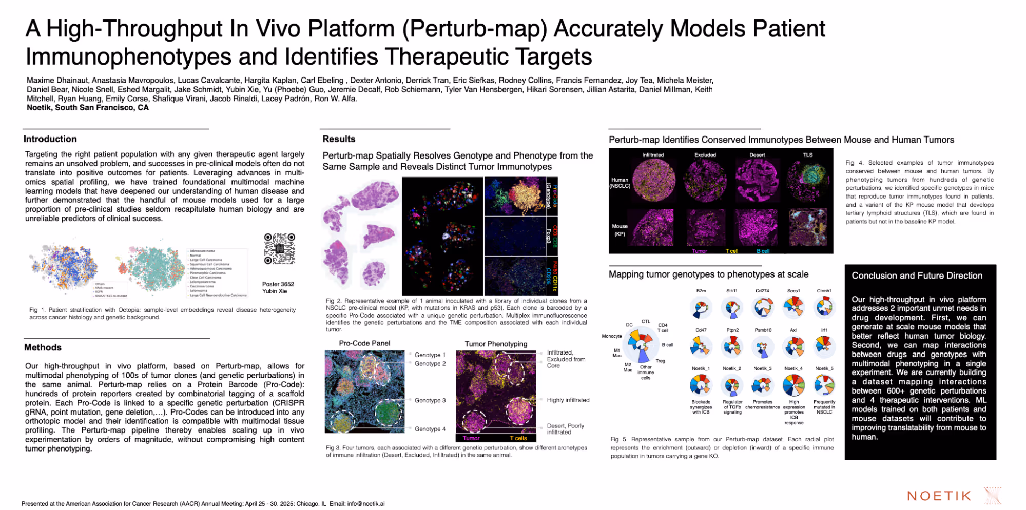 Perturb-map highlights Noetik’s platform that models human immunotypes in vivo at scale, bridging critical gaps between traditional mouse models and real-world patient biology. “This initial dataset - mapping the impact of >600 perturbations on tumor immunotypes and response to immune checkpoint blockade - demonstrates that we can generate mouse models at scale that better capture the heterogeneity of human disease” said Maxime Dhainaut, Ph.D., Director of Spatial Functional Genomics at Noetik and presenter. “We can now test pharmacologic and therapeutic hypotheses in these models simultaneously, which helps to identify which patient population would benefit the most from any given drug.”