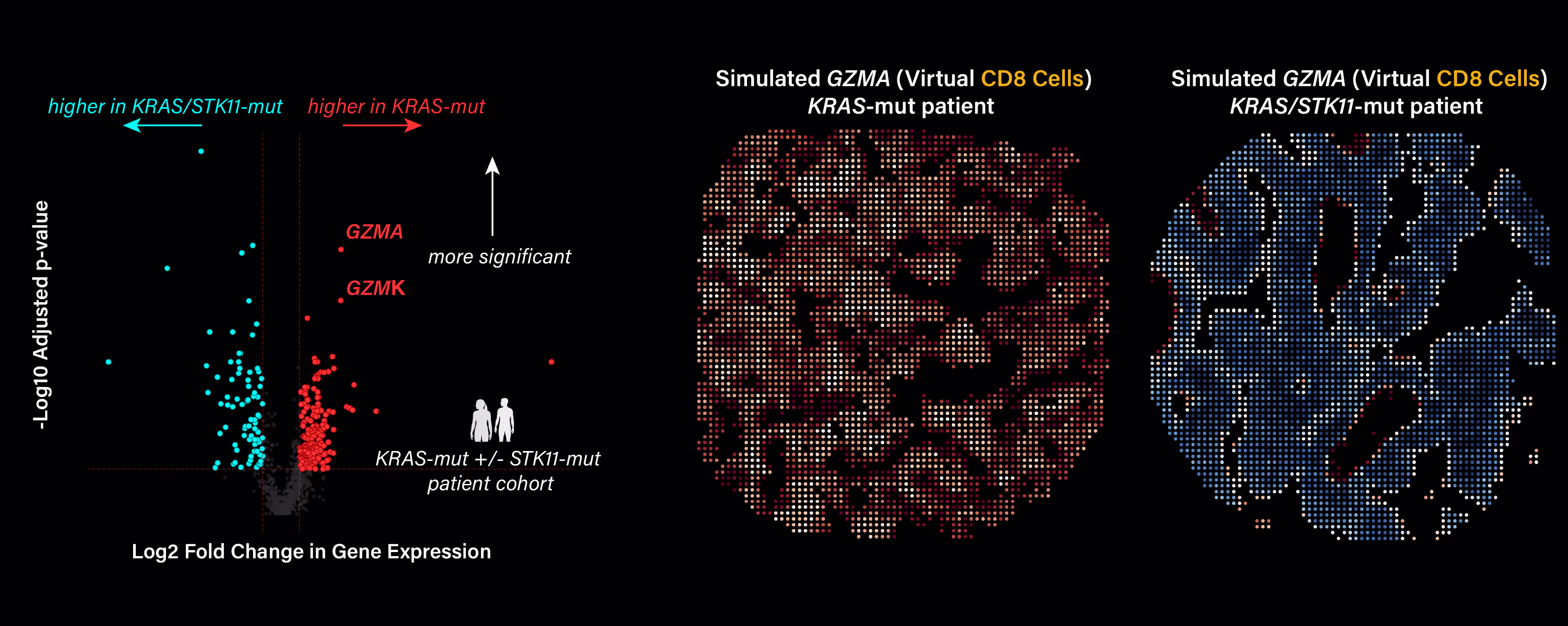 We used virtual cell simulations to look for differences in CD8 cell state between patients with and without STK11 mutations. To do this we prompted OCTO-vc with v-CD8 cells at each position in each tumor from hundreds of patient samples and compared predicted gene expression across the aggregated STK11 normal and STK11-mutated cohorts. This revealed a specific subset of cytotoxic effector genes, including Granzyme A (GZMA) and Granzyme K (GZMK), predicted at lower levels in STK11-mutated patients – suggesting that CD8 cells in these patients may be less effective at killing tumor cells in a way not addressed by current immunotherapies. This raises the question of what factors in the tumor microenvironment are responsible for the v-CD8 phenotype.